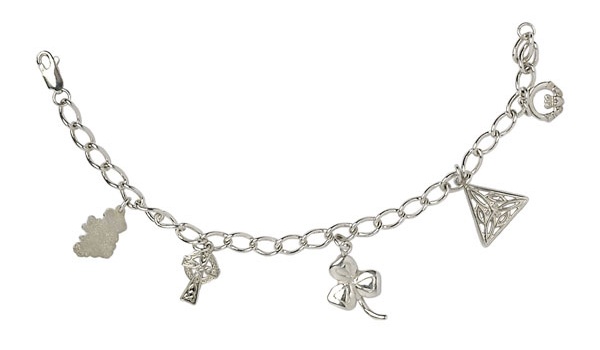 A solid sterling silver Irish charm bracelet is a way of brandishing your Irish heritage on your wrist. There are five charms featured on the bracelet, depicting many facets of Irish culture and heritage: