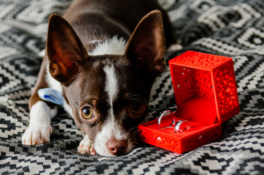 Some couples take it even further and decide to have their dog actually carry the rings to the altar for them. There are many options, especially for those nervous about the safety of the rings. Tying fake rings to the collar or dressing up the dog in a floral collar or bow tie is a way of including them while also having a dedicated safe keeper for the rings. For those who are braver, there are special bow tie collars with clips on them to secure and hold the precious wedding rings while they're attached to the dog of the moment!