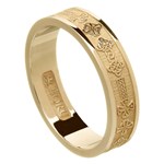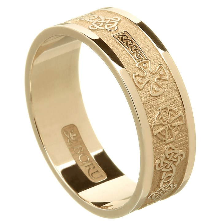 This beautiful Celtic Cross yellow gold ring recreates this important Irish symbol and is beautifully embossed with the patterns on each cross clearly engraved. This very special ring is available foe ladies and gents in 10k and 14k gold and the detail in the repeat pattern of the crosses around the band gives this piece additional meaning and resonance that will stand the test of time.