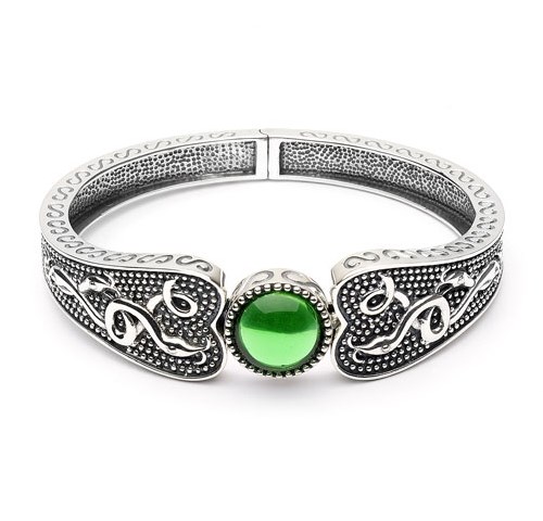 Decorated with a beautiful green glass stone in its main setting, this Viking wide bangle is made from oxidized sterling silver giving the bangle a blackened appearance. It is also granulated with sterling silver to show off its Viking style. The piece is influenced by the artifacts found at the Viking site in Wood Quay, Dublin.