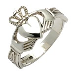 Ireland’s Trinity knot is one of its most recognized ancient symbols and can be seen on monuments throughout the country and in literature. It is a very simple motif and looks particularly good in jewelry. The Trinity knot is embedded into this stunning Claddagh Ring, which is available in 10k and 14k white gold.