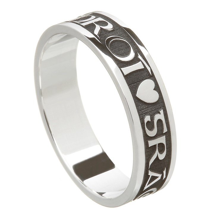 Celebrate your eternal bond with the Love of My Heart Oxidized Silver Wedding Ring, a beautifully crafted piece that embodies the timeless Irish sentiment of love. This elegant band features the Gaelic inscription “Grá Geal Mo Chroí”, meaning “Bright Love of My Heart”, elegantly etched around the band. The oxidized finish enhances the contrast, highlighting the inscription and adding a touch of vintage charm.