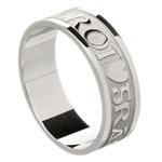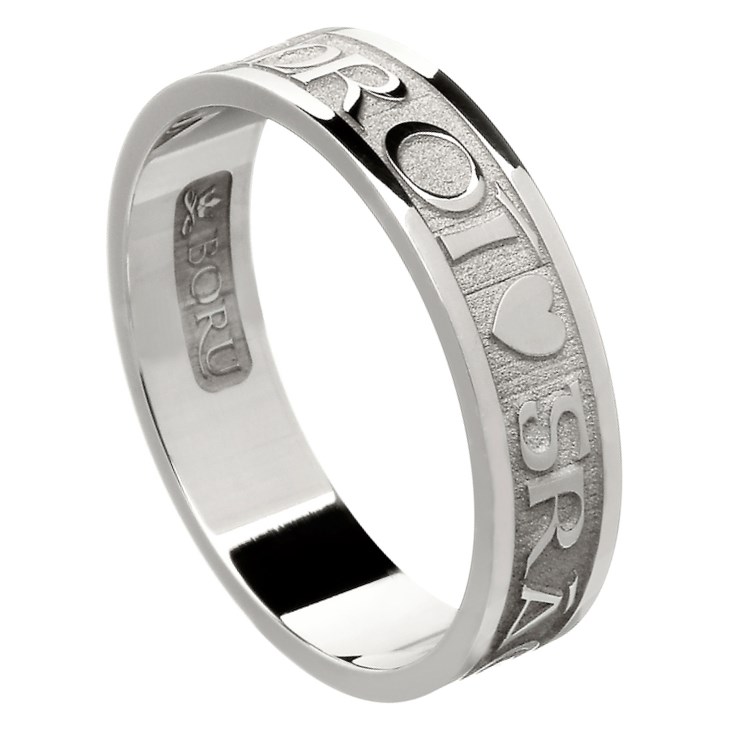 The Love Of My Heart wedding ring is crafted in white gold and infused with meaningful heritage. The band bears the Gaelic inscription “Grá Geal Mo Chroí”, translating to “Bright Love of My Heart” (pronounced: Graw Gal Muh Kree).