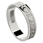 The white gold finish provides a modern, refined take on a traditional wedding band - cool tones that complement many styles. The inclusive pairing of inscription, symbolic heart and ancient motifs makes a timeless piece with deep personal and cultural resonance.