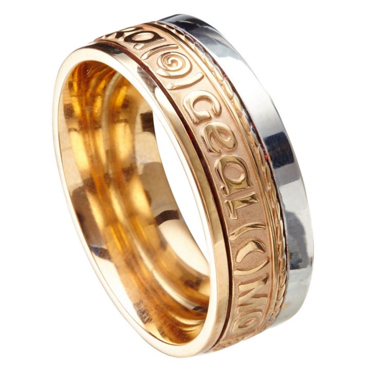 The inscription ‘Love of my Heart’ translated and written in Gaelic as ‘Gra Geal Mo Chroi’ is at the center of this most special ring from our Eternal Promise Collection. The ring also includes the engraving of a spiral and heart motif and gold and a white gold rail contrast to give it added appeal.