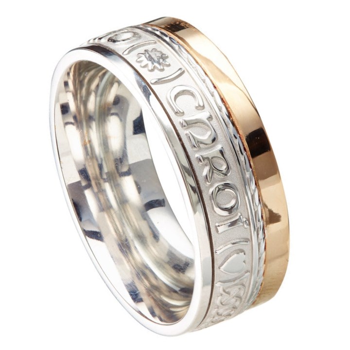 When choosing an Irish or Celtic ring, it is a good idea to examine the meaning behind the tradition. ‘Gra Geal mo Chroi’ translates as ‘Love of my heart’ and these words are combined with a heart and spiral Celtic pattern to convey the romantic message. The engraved part in silver is set apart with a yellow gold rail for contrast and enduring effect.