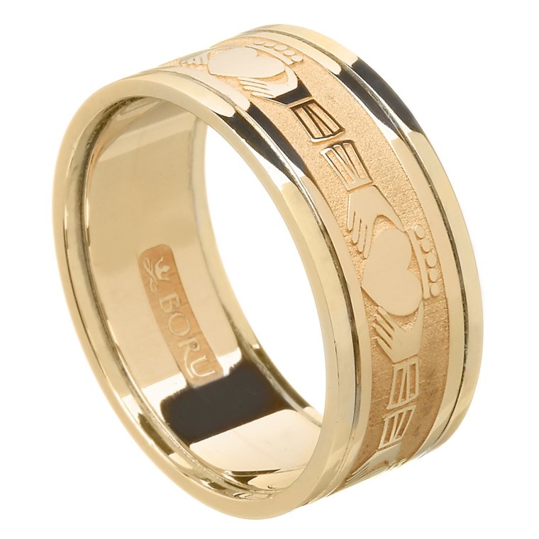 It is designed for comfort and everyday wear and it takes the ancient Claddagh and brings it up to date with a beautiful repeat pattern throughout the band of the Claddagh symbol of hands for friendship, a crown for loyalty and a heart for love at the center. This is Irish design at its very best.