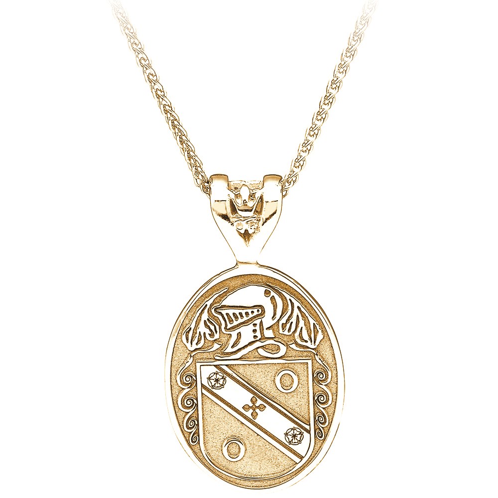 This Coat of Arms Oval Yellow Gold Pendant can be engraved and personalized with the coat of arms that matches your family name. The exquisite detail will showcase Irish and Celtic heritage to perfection and will be a timeless piece to treasure. It is a true badge of honor!