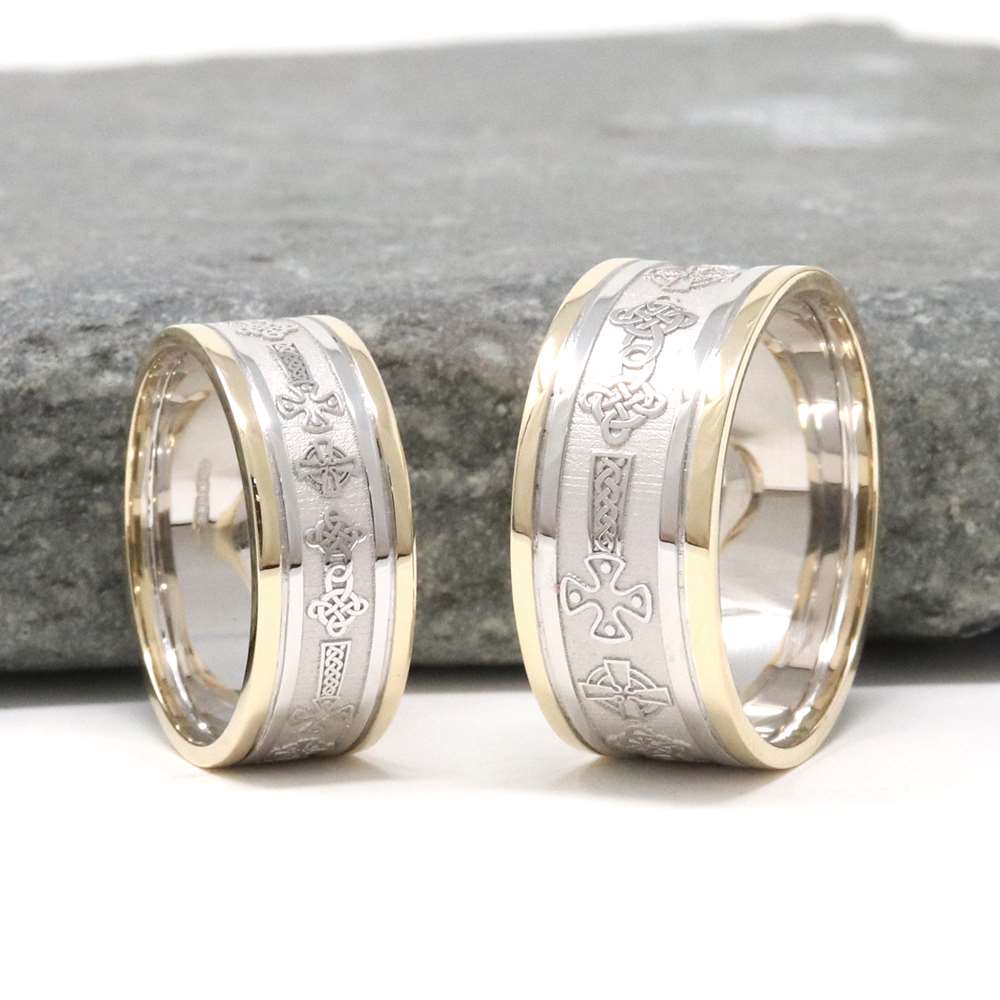 At first glance this ring is a simple piece of jewelry, but a closer look reveals beautiful designs of intricate Celtic crosses around the band. The Celtic crosses featured in this ring are varied and a selection of different shapes and sizes representing the many interesting crosses scattered around the country. The silver wedding ring, which is available as a set of ladies and gents has a gold trim which adds a pure layer of luxury.