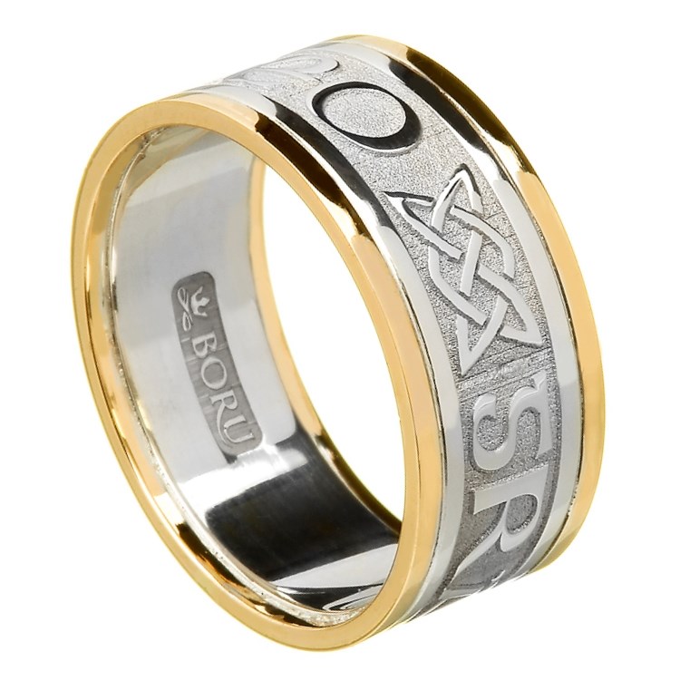 ‘Grá go deo’ is the Irish for ‘Love Forever’ and this evocative message is engraved in sterling silver at the center of this ring along with a trinity knot motif - one of Ireland’s most famous symbols.  This silver wedding band, which is available as part of a matching pair has a contrasting yellow gold trim adding a layer of luxury to this stunning piece.