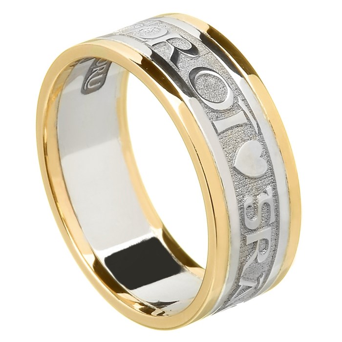 ‘Love of my Heart’ is the wonderfully romantic message within this stunning Irish wedding ring. The words are engraved in the central sterling silver band in the Irish language ‘Grá mo Chroí’. There is also a heart motif engraved in to the central band for added impact and this beautiful Irish Celtic ring is set off perfectly with a gold trim on either side of the band.