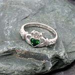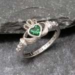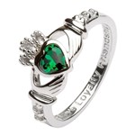 This elegant May birthstone Claddagh ring with Emerald cubic zirconia stone is available in solid sterling silver.