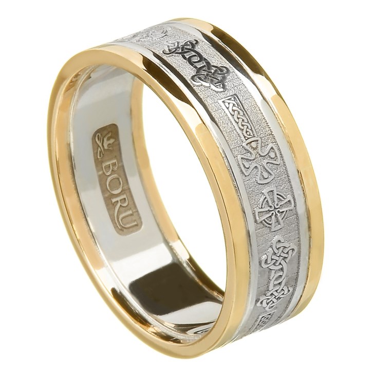 The two tone contrast of white gold with yellow gold results in a stand-out wedding ring. The ring references the ancient history of Celtic times and features beautiful Celtic high crosses in a pattern interspersed with traditional Celtic knots.