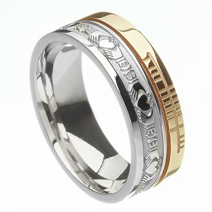 The reason that this Claddagh Faith White Gold with Yellow Rail Band stands out is that it incorporates both white gold and yellow and the contrast will really be a talking point. The materials really complement each other and this is not your average piece of jewelry. What’s even more special about this piece is that it is inscribed with the word ‘faith’ in Ogham script – the ancient Irish alphabet.