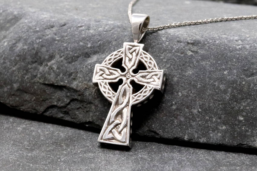 The great thing about this Celtic cross necklace is that it's double sided which is very practical in addition to being a beautiful representation of Irish and Celtic culture. Engraved on both sides with highly elaborate designs, this is just like the free standing monuments dotted across the Irish countryside. As the legend goes, these crosses first emerged at the time of the Celtic druids to honour the pagan sun god. When Saint Patrick arrived to introduce them to Christianity, he incorporated the Roman cross and used the circle to symbolise never ending love.