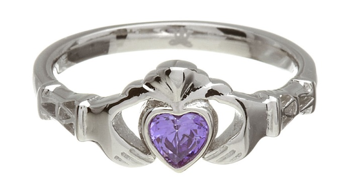 The amethyst birthstone Claddagh ring from Rings from Ireland is available in silver, 10k and 14k yellow gold and also in 10k and 14k white gold. There is also a matching set of elegant Claddagh earrings with amethyst stones in silver, 10k and 14k yellow gold and also in 10k and 14k white gold.