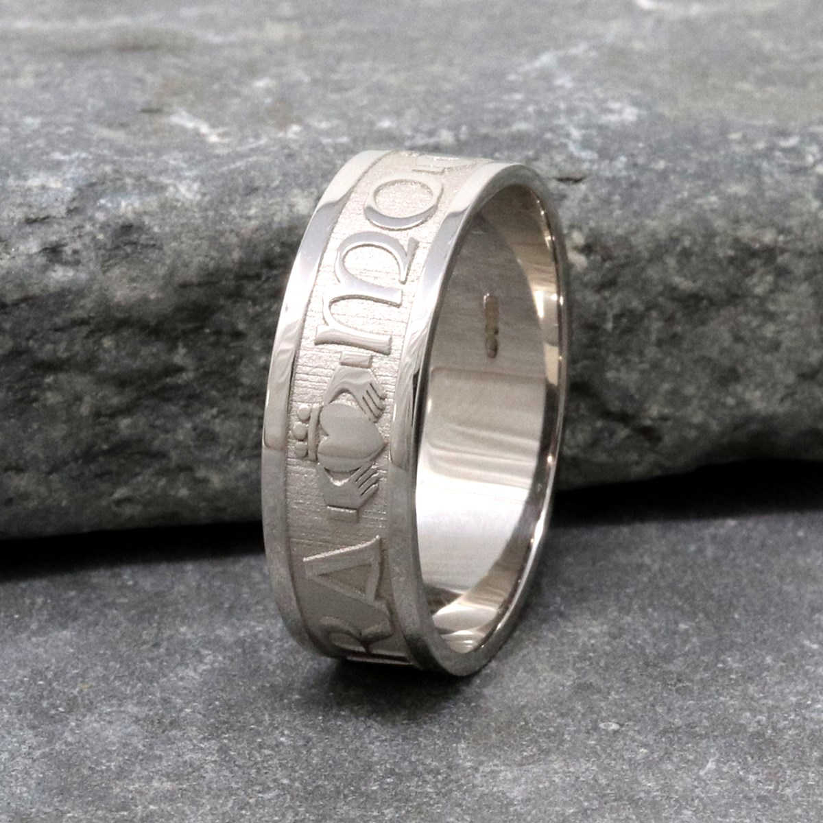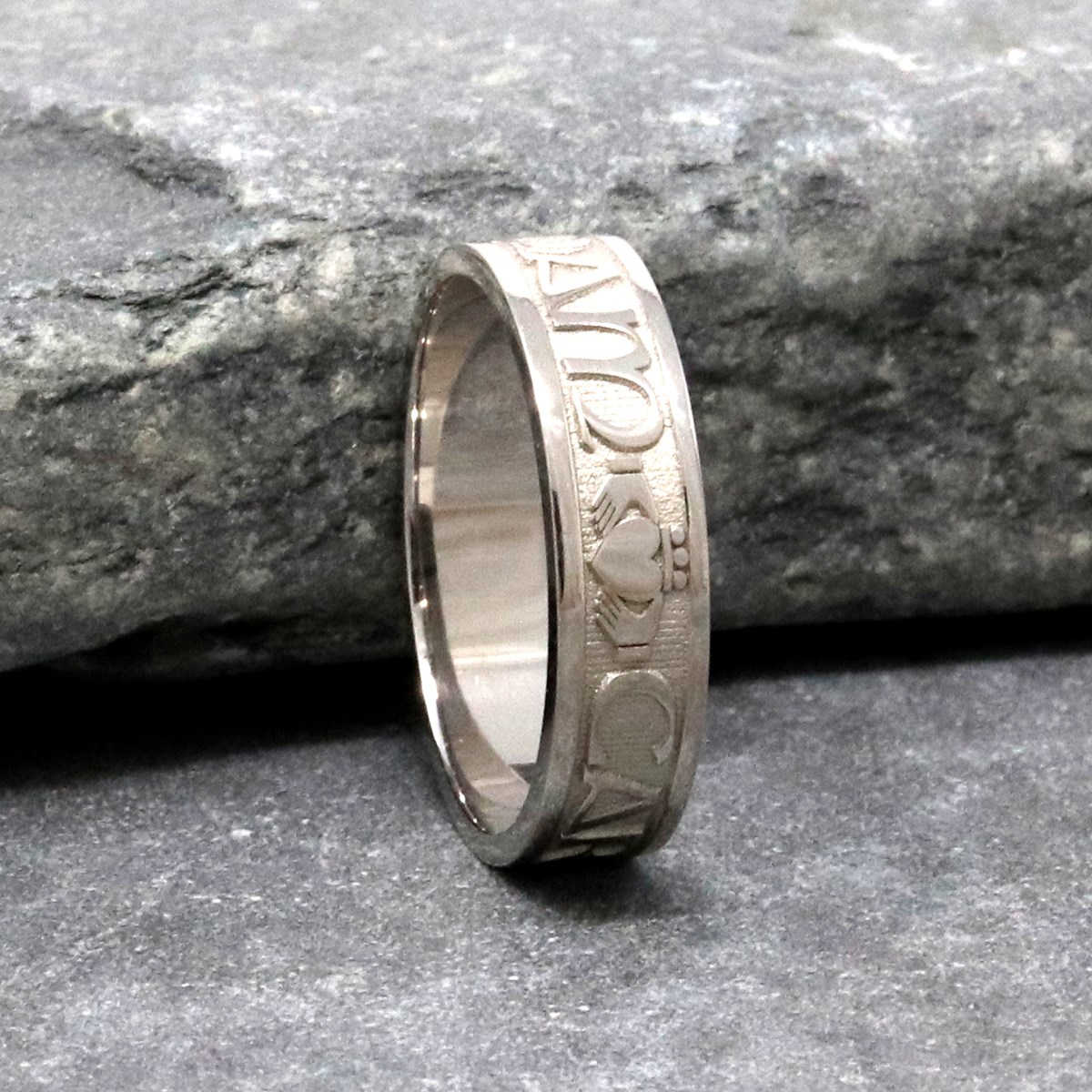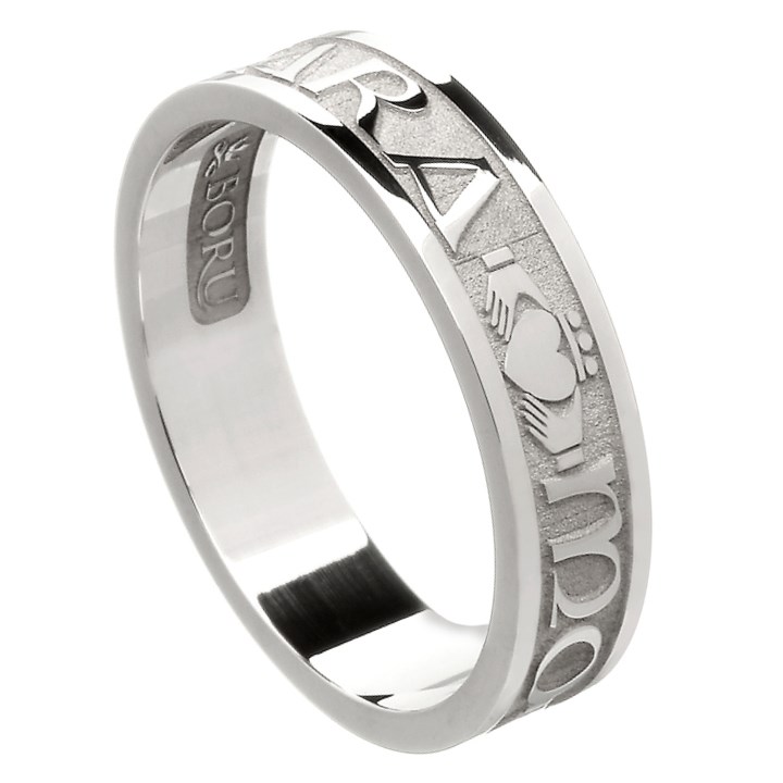 Die irische Sprache zählt zu den romantischsten der Welt, und ein handgefertigter irischer Ring mit einer so ausdrucksstarken Botschaft verleiht einem der wichtigsten Schmuckstücke in jeder Sammlung zusätzliche Bedeutung und Mystik. Dieser Ehering wird ein Leben lang geschätzt.