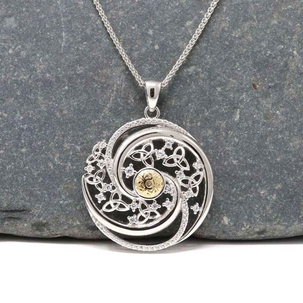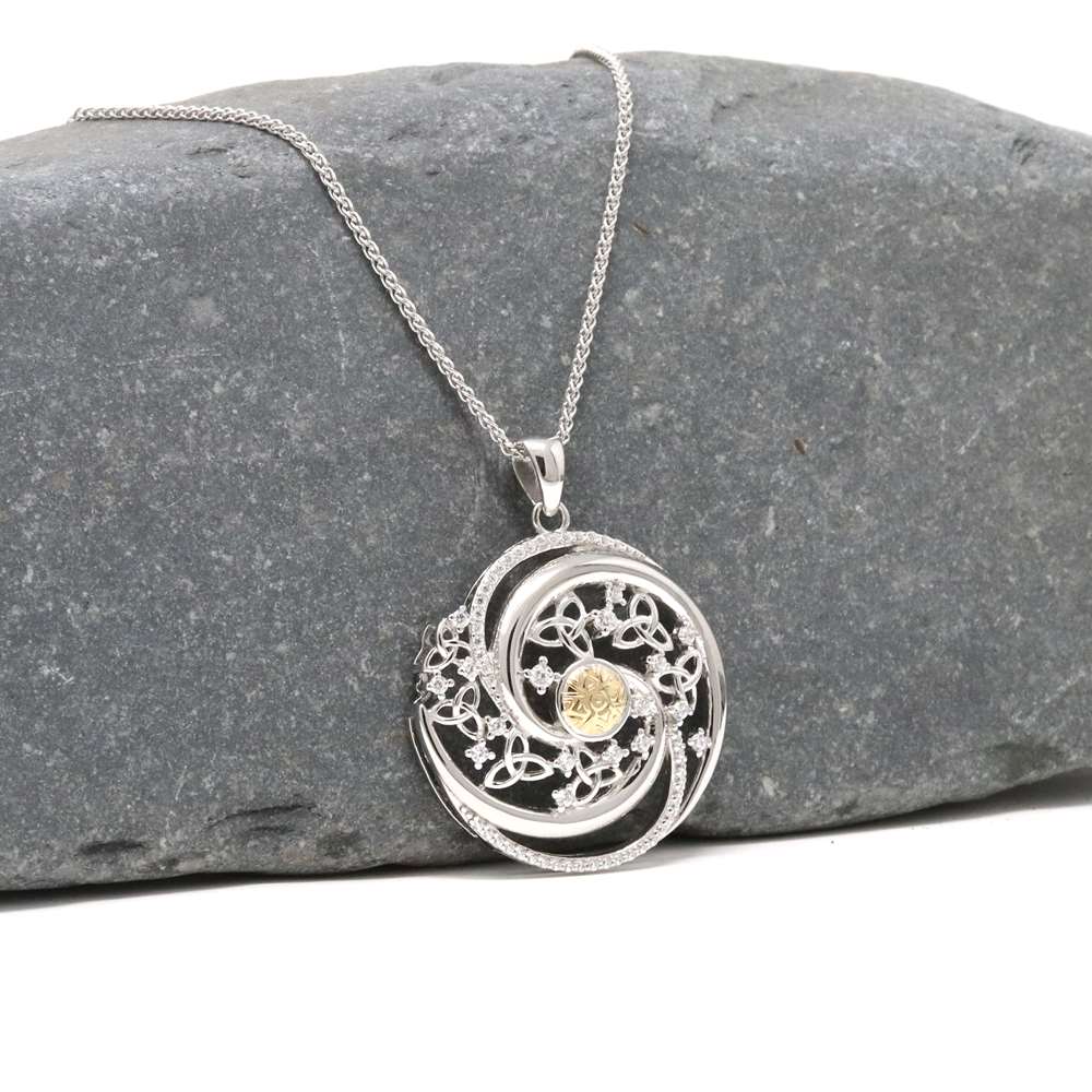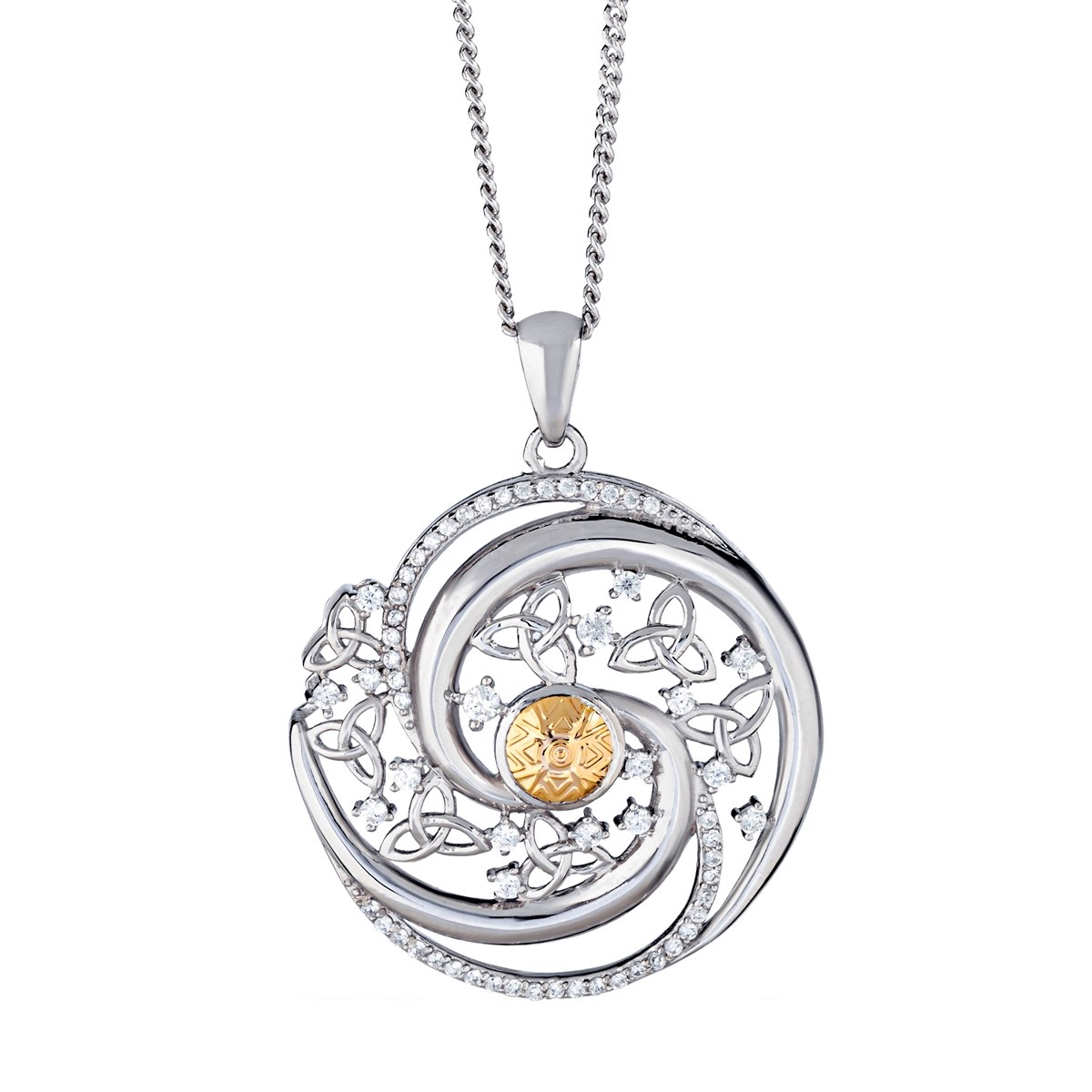 Der Anhänger ziert auch der Dreifaltigkeitsknoten, eines der wichtigsten und ältesten irischen und keltischen Symbole und ein starkes Zeichen kultureller Identität. Für zusätzlichen Glanz sorgen Zirkonia-Steine, die in zwei Halbkreisen angeordnet und über das gesamte Design verteilt sind. Sie funkeln und lenken die Aufmerksamkeit auf die bedeutungsvollen Symbole dieses atemberaubenden Anhängers.