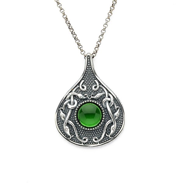 El colgante presenta una compleja textura decorativa lograda mediante la oxidación de la plata y la granulación de la superficie, lo que le confiere su aspecto distintivo. Además, está adornado con una llamativa piedra de vidrio verde en su engaste principal que capta la atención de inmediato.