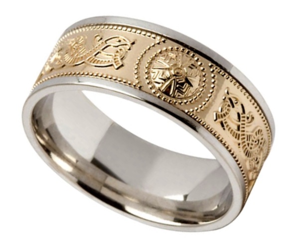 Ardagh Chalice de Irlanda fue descubierto en 1868 por dos hombres que estaban cavando un fuerte en Ardagh, Limerick del condado. Su descubrimiento resultó ser el mejor ejemplo del trabajo del metal del octavo siglo encontrado nunca. Este anillo de oro amarillo dorados rodeado de bandas de plata se inspira en esta obra maestra irlandesa e incluye bellos grabados similares a los del cáliz.