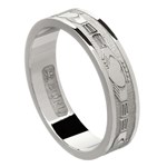 Esta alianza de boda Claddagh de oro blanco está disponible para hombre y mujer en oro blanco de 10k y 14k. Es una pieza elegante y a la vez discreta, donde cada símbolo tiene un significado especial: las manos representan la amistad, la corona la lealtad y el anillo central el amor. El símbolo Claddagh se repite a lo largo de la alianza, de modo que se puede apreciar desde cualquier ángulo.