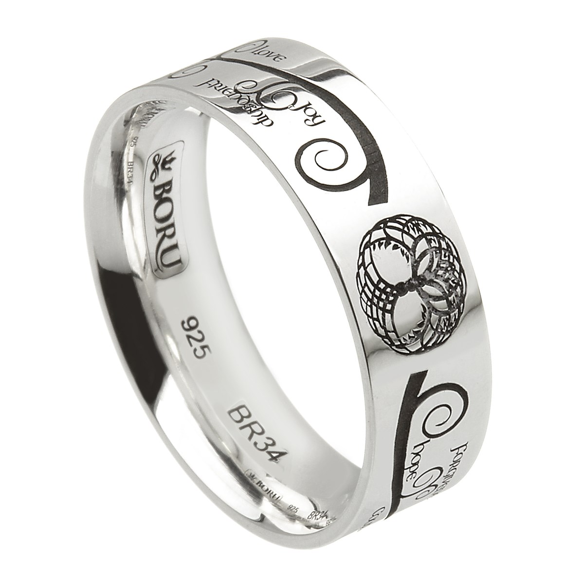 Este anillo de boda ancho de plata con el Árbol de la Vida está cargado de significado, historia y esperanza para el futuro. Su diseño extra ancho ofrece mayor comodidad a quien lo lleva, si este es su estilo preferido, y además permite apreciar mejor los hermosos grabados que lo rodean. Este anillo, que puede adquirirse en pares, toma el símbolo del Árbol de la Vida y lo plasma en esta excepcional joya con un patrón repetitivo que representa la inmortalidad.