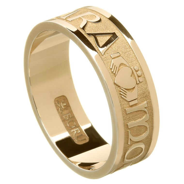 Cette magnifique bague comporte trois symboles irlandais Claddagh, et entre chaque Claddagh figurent les mots irlandais « Mo Anam Cara » (prononcé : Muh Onum Kara), qui signifient « Mon ami d'âme ».