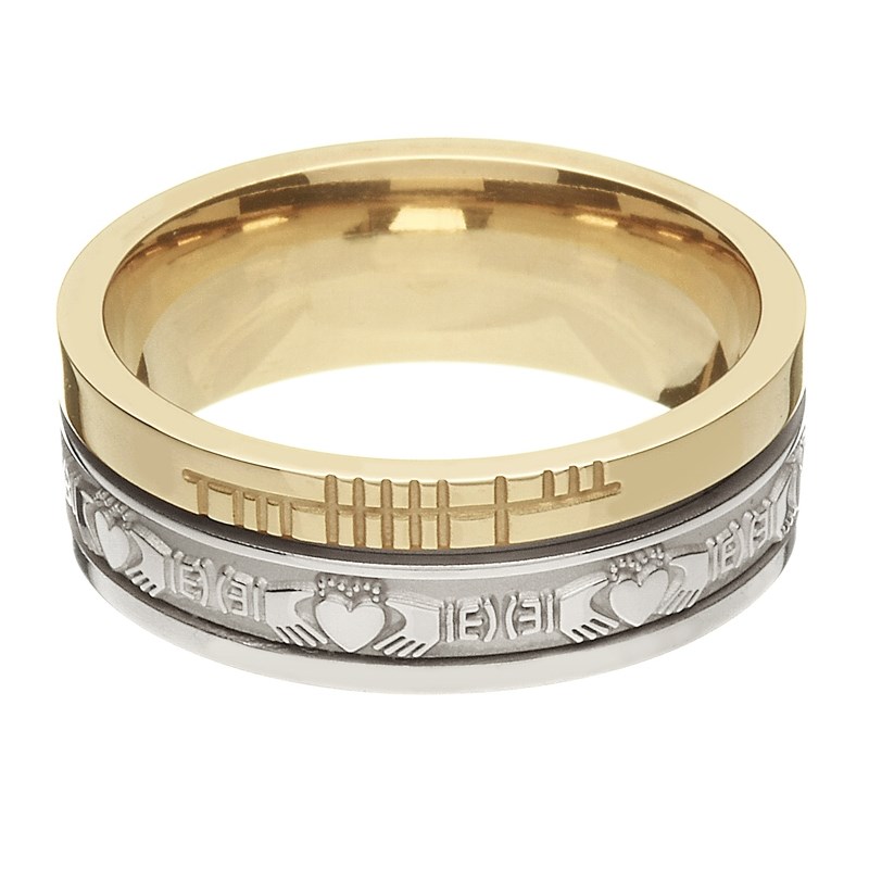 Cependant, un examen plus attentif révèle une signification supplémentaire à cette bague. La partie en or blanc arbore un symbole de Claddagh répété, symbolisant l'amour, l'amitié et la loyauté. La partie en or jaune est ornée de l'écriture oghamique, une magnifique langue ancienne irlandaise , où est inscrit le mot « Foi ».