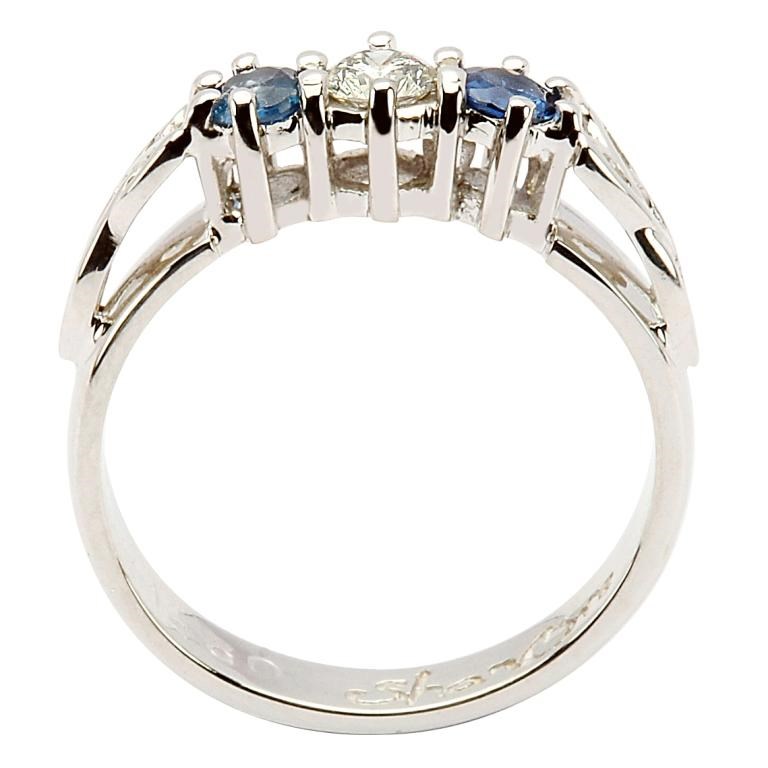 Le diamant de 0,15 carat orne le centre de cette bague sertie haut, flanquée de deux saphirs de 3,24 mm. Le nœud de la Trinité, détail décoratif, évoque le patrimoine et les traditions irlandaises. Cette bague est un exemple remarquable du savoir-faire artisanal irlandais.