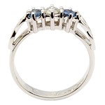 Le saphir bleu froid est une pierre très prisée. Symbole de clarté d'esprit, de paix et de pureté, il est particulièrement mis en valeur associé à un diamant. La bague de fiançailles « Nœud Trinité » en diamant et saphir est ornée de deux saphirs et d'un diamant sur un anneau en or blanc 14 carats massif.