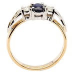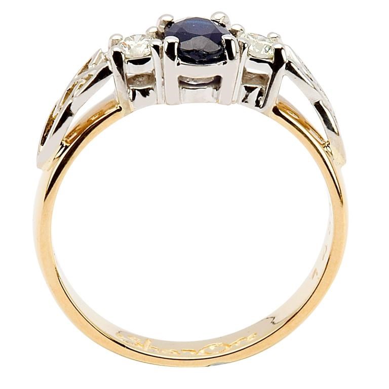 Le saphir central est encadré de deux diamants, sertis de part et d'autre par un nœud trinitaire en or blanc. L'ensemble est sublimé par un anneau en or jaune 14 carats massif. Ce saphir d'un bleu acier est un choix somptueux pour une bague de fiançailles qui traversera les années.
