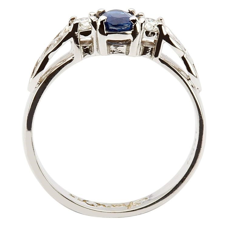 Un saphir ovale d'un bleu froid orne le centre de la bague de fiançailles « Nœud Trinité » en saphir ovale et diamants. Sertie entre deux diamants, cette pierre précieuse se détache avec éclat sur l'or blanc 14 carats massif.