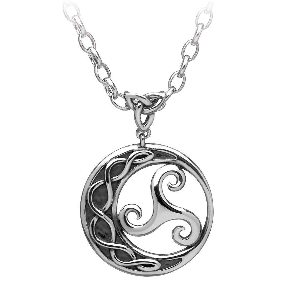 Le pendentif Triscele Newgrange Circle célèbre également le célèbre nœud de la Trinité irlandais, riche de significations chrétiennes et profanes, symbolisant l'unité et la longévité. Ce nœud est ici réinterprété de façon moderne. Légèrement décentré, il laisse magnifiquement transparaître la lumière. Un entrelacs latéral représente l'absence de commencement et de fin.