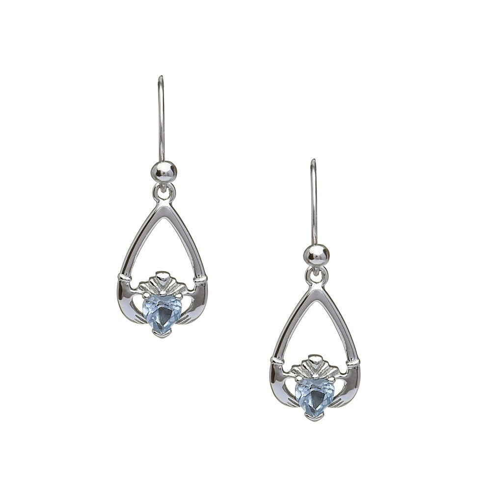 Ces élégantes boucles d'oreilles Claddagh, ornées de pierres d'aigue-marine et symbolisant la pierre de naissance du mois de mars, sont disponibles en argent, en or jaune 10 et 14 carats ainsi qu'en or blanc 10 et 14 carats.