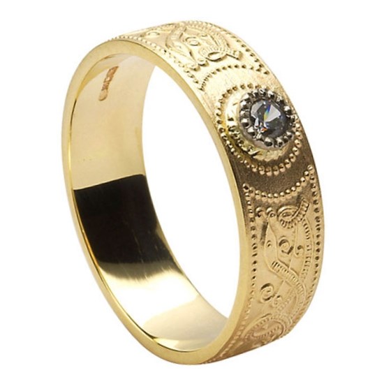 Ce calice, datant du VIIIe siècle en Irlande, est considéré comme l'une des plus belles pièces d'orfèvrerie irlandaise et celtique jamais découvertes. Ses motifs illustrent avec élégance le patrimoine et l'histoire. Cette bague est disponible en paire assortie, en or jaune ou blanc 10 ou 14 carats. Le diamant, de pureté VS et de couleur G, pèse entre 0,05 et 0,10 carat selon la taille de la bague. Célébrez votre histoire et votre héritage tout en vous tournant vers l'avenir avec cette bague exceptionnelle.