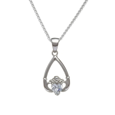 Il y a aussi un élégant pendentif Claddagh de birthstone d'avril qui peut être porté seul ou dans le cadre de l'ensemble. Ceci est disponible en argent, or blanc ou or jaune allant de 10k à 14k.