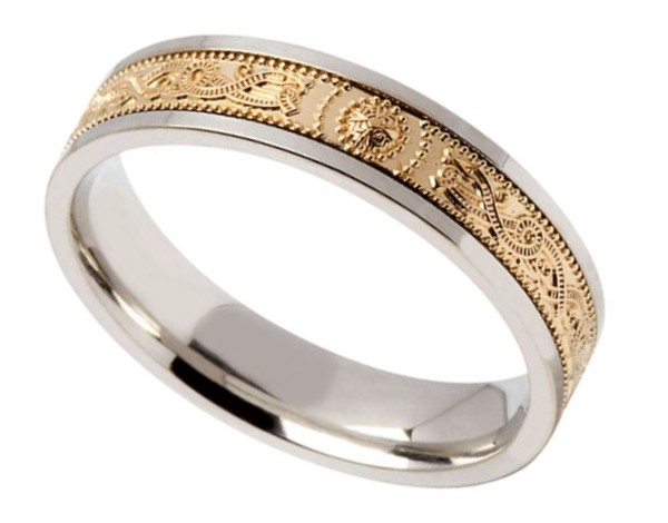 La magnifique collection Celtic Warrior à Rings from Ireland a été inspirée par le Chalice irlandais Ardagh. La bande d'argent Thise a un centre en or jaune avec des motifs géométriques, inspirés par le mouvement artistique La Tene celtique. L'anneau est une pièce complexe qui est souvent choisie comme une alliance, mais elle peut également être utilisée comme une pièce autonome.