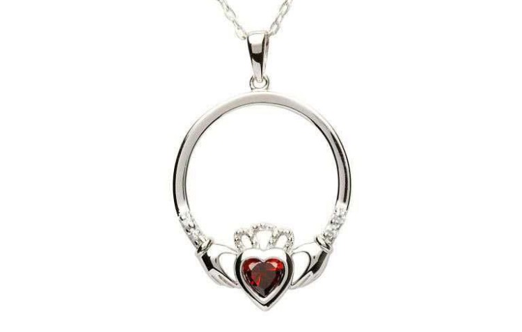 Le Claddagh a un cœur au centre symbolisant l'amour, puis une couronne au sommet pour la loyauté et des mains pour l'amitié. Avec la collection de pierres précieuses, chaque bague comprend une pierre spéciale placée dans le cœur, que ce soit l'élégant grenat de janvier ou la belle topaze de décembre, les bagues qui portent «Amour, loyauté et amitié». gravé à l'intérieur sont un cadeau à être chéri. Les bijoux de naissance peuvent également venir sous la forme d'un magnifique pendentif en argent Claddagh.