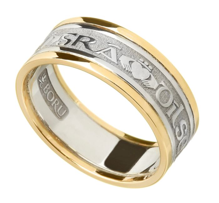 Il y a aussi de beaux bijoux avec des messages très émouvants gravés dans le design comme ce simple pendentif en argent avec la phrase irlandaise Mo Anam Cara qui se traduit par la belle description de `` My Soul Mate ''. Si vous êtes à la recherche d'un bijou, d'une bague de fiançailles ou d'une alliance, cette superbe bague bicolore en or blanc / or jaune a les mots irlandais Gra, Dilseacht, Cairdeas inscrits qui signifient Amour, Loyauté, Amitié.