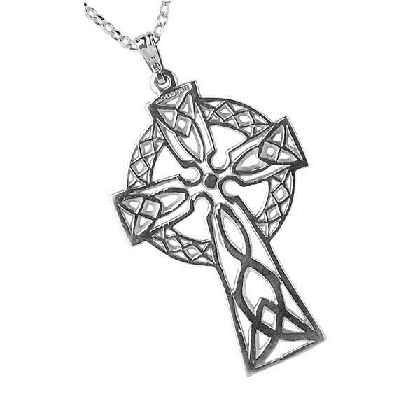 Les croix celtiques d'Irlande sont des symboles finement décorés que l'on retrouve dans tout le pays. Leurs motifs, très variés, comprennent des nœuds, des rubans entrelacés et des spirales. Cette magnifique croix celtique en filigrane est particulièrement impressionnante de par sa grande taille, et l'argent massif offre un écrin parfait au nœud de la Trinité qui y est gravé.