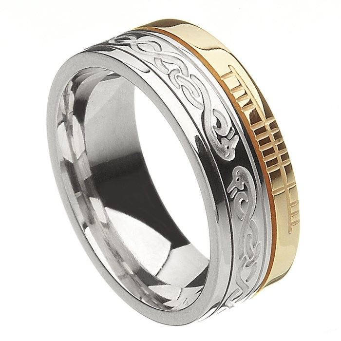 La partie en or jaune de la bague est ornée d'inscriptions en ogham, l'ancien alphabet irlandais : des lignes et des symboles qui se traduisent par le mot « Foi ». L'autre partie de la bague, qui fait partie de la collection « Foi » de Rings from Ireland, présente des inscriptions tirées du Livre de Kells .