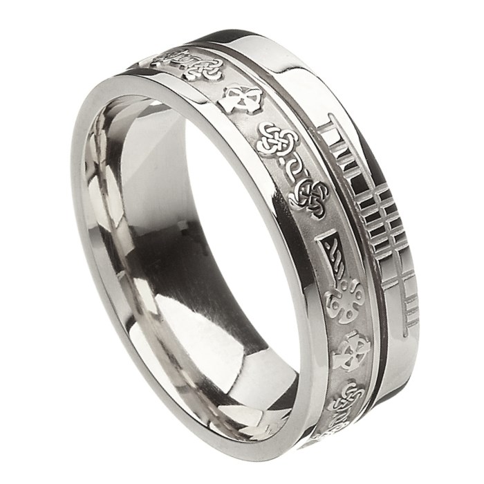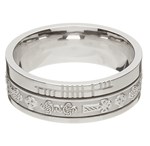 Cette bague en or blanc ornée de croix celtiques est une pièce magnifique et marquante, disponible en or blanc 10 et 14 carats. Elle possède une double signification : d’un côté, une série de croix celtiques est intégrée au motif. Ces croix, omniprésentes dans le paysage irlandais et présentes sur de nombreux sites sacrés anciens, sont un magnifique symbole de culture et d’histoire.