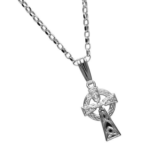La croix celtique, avec son cercle à l'intersection, est un symbole profondément évocateur de l'histoire irlandaise et celtique. Deux des plus beaux exemples de croix celtiques d'Irlande se trouvent à Monasterboice et Glendalough. Ce magnifique collier en or blanc, orné d'une croix celtique double face, présente des motifs gravés sur ses deux faces, inspirés des entrelacs insulaires, dont le célèbre nœud de la Trinité sur chaque branche. Ce nœud est complété par un nœud de continuité sur le cercle central, symbolisant l'éternité.