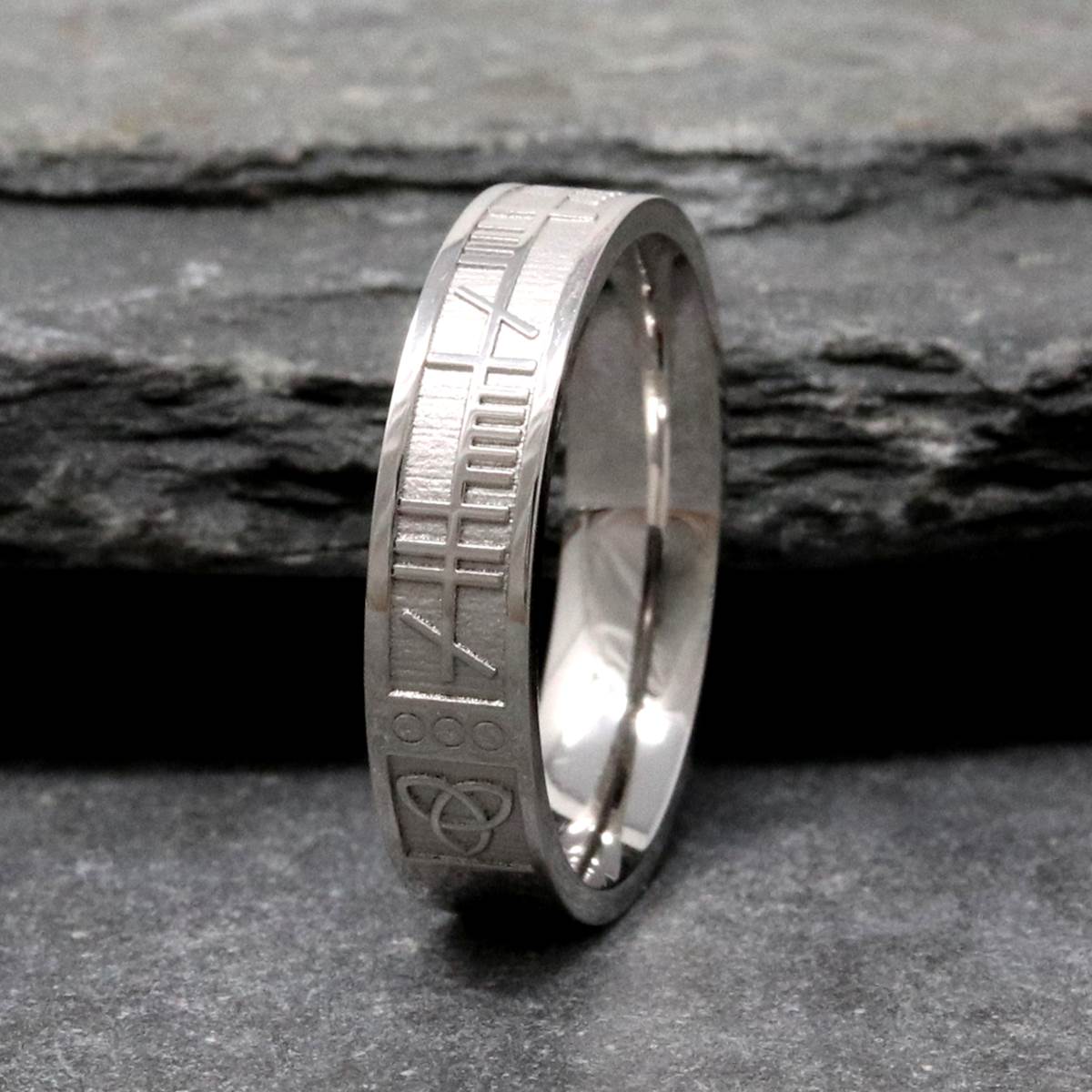 L'écriture oghamique, composée de traits parallèles sur une ligne continue, était utilisée dans l'Irlande ancienne et se retrouve sur des monuments datant des Ve et VIe siècles. Son intégration au design de la bague lui confère une dimension historique et une signification personnelle profondes. Le nœud de la Trinité, symbole d'absence de commencement et de fin, renforce encore cette symbolique, représentant un engagement pour la vie.