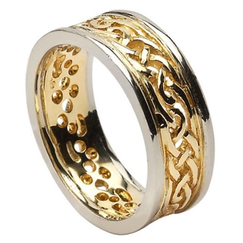 Ces magnifiques alliances en filigrane, d'une grande finesse, sont disponibles avec un anneau central en or jaune et des bordures en or blanc. Le motif infini des entrelacs symbolise l'amour et l'engagement éternel scellés par les vœux sacrés du mariage.