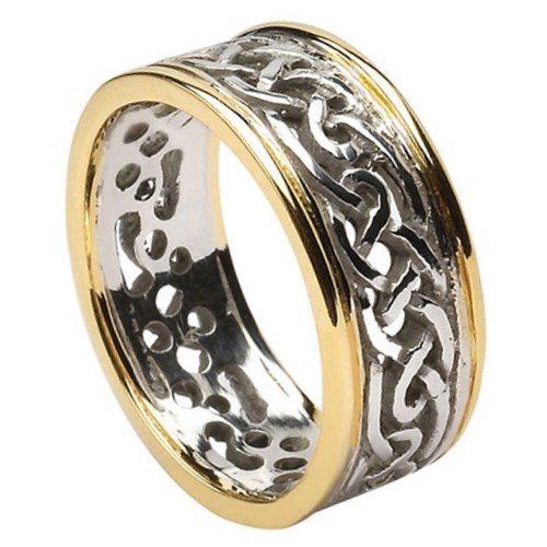 Cette alliance en filigrane celtique est remarquable par son design complexe. Le filigrane est une technique de joaillerie qui consiste à tordre le métal selon différents motifs puis à le fusionner. Ces alliances sont disponibles en or blanc avec des finitions en or jaune. Le motif du nœud, qui semble se prolonger à l'infini, symbolise l'engagement des époux l'un envers l'autre lors de leur union.