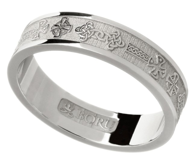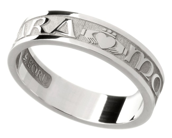 Mo Anam Cara si traduce come "My Soul Mate" e questo anello che è disponibile in coppia abbinata ha questo messaggio al centro. È intervallato da tre simboli irlandesi Claddagh di nuovo un altro simbolo irlandese famoso e senza tempo, che si distingue magnificamente nella fede nuziale in oro bianco .