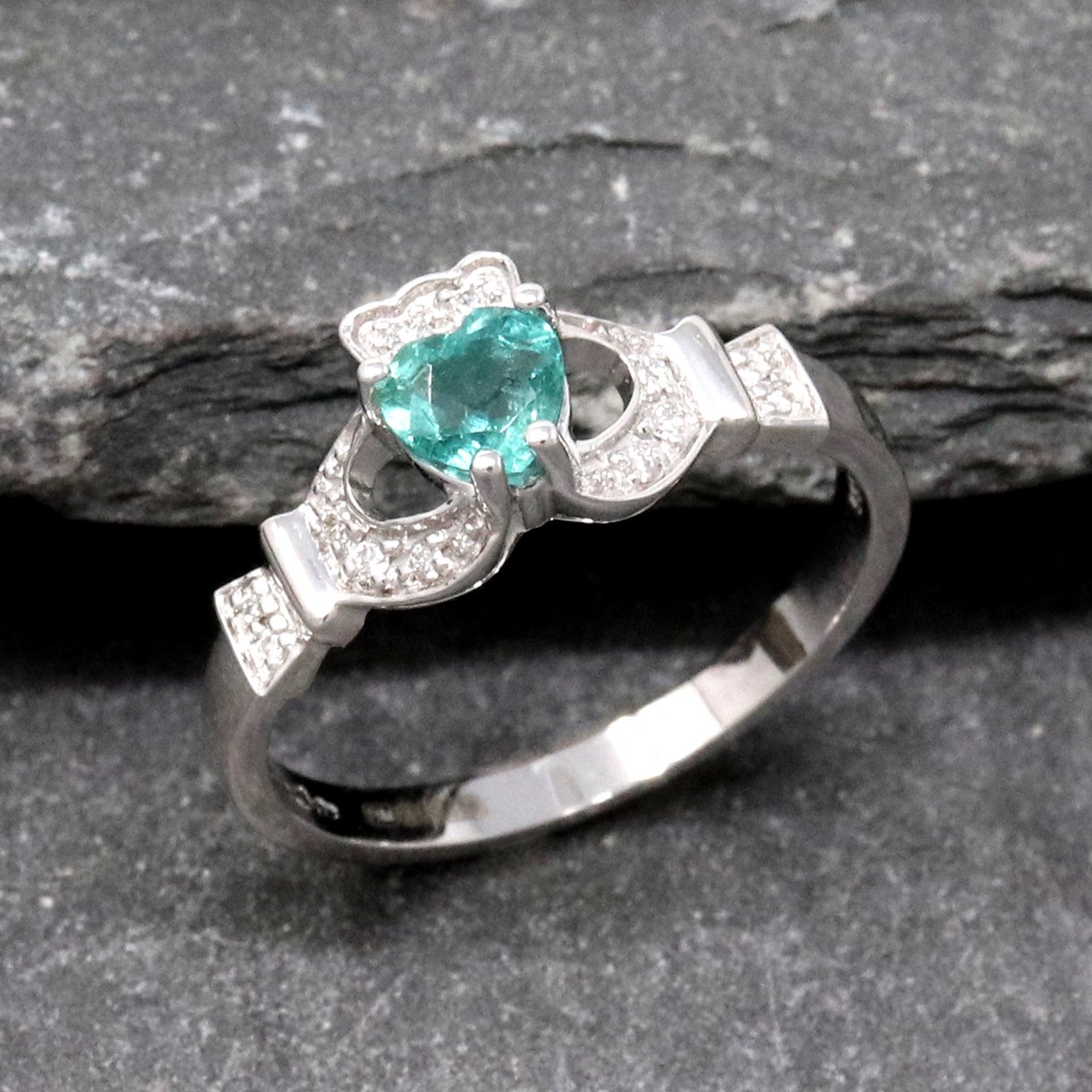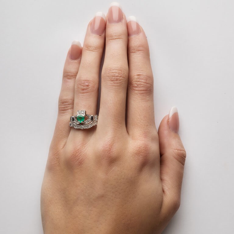 "Con queste mani ti dono il mio cuore e lo incorono con il mio amore" è il messaggio tradizionale che accompagna l'anello Claddagh. Questo preziosissimo simbolo irlandese e celtico è famoso in tutto il mondo e questo anello è impreziosito da magnifiche pietre preziose che mettono in risalto il cuore, la corona e le mani.
