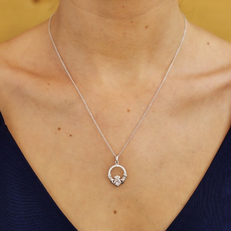 Il ciondolo presenta il tradizionale motivo Claddagh: mani che simboleggiano l'amicizia, un cuore che simboleggia l'amore e una corona che rappresenta la lealtà.