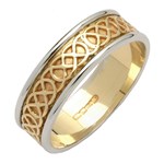 このツートンリングは、ひときわ目を引くジュエリーです。ケルトの結び目模様は、始まりも終わりもない永遠と愛を象徴しています。リング全体を囲むように配され、両脇にはイエローゴールドが配され、美しいホワイトゴールドとのコントラストが際立っています。